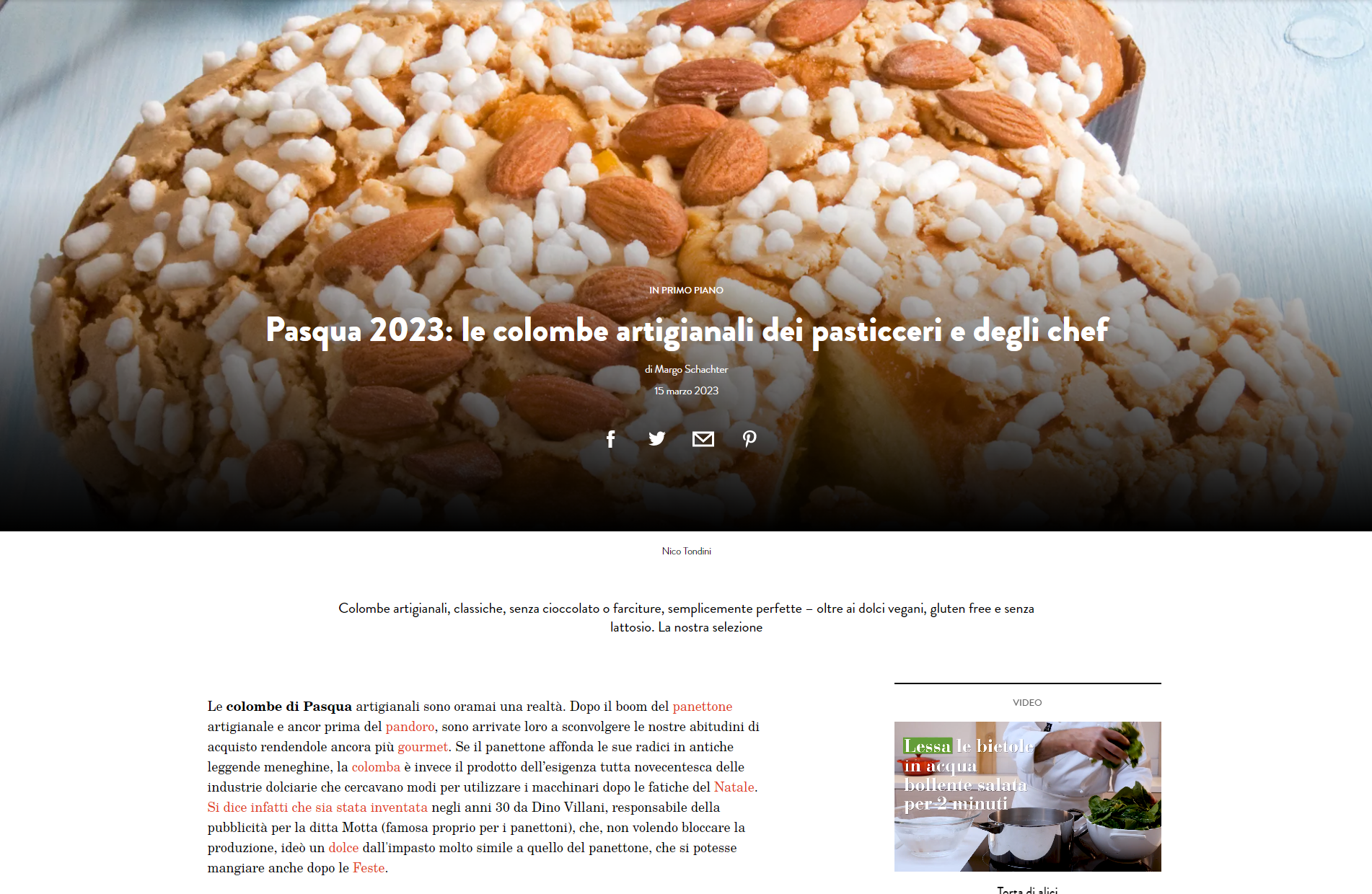 Le colombe di Pasqua artigianali sono oramai una realtà. Dopo il boom del panettone artigianale e ancor prima del pandoro, sono arrivate loro a sconvolgere le nostre abitudini di acquisto rendendole ancora più gourmet. Se il panettone affonda le sue radici in antiche leggende meneghine, la colomba è invece il prodotto dell’esigenza tutta novecentesca delle industrie dolciarie che cercavano modi per utilizzare i macchinari dopo le fatiche del Natale. Si dice infatti che sia stata inventata negli anni 30 da Dino Villani, responsabile della pubblicità per la ditta Motta (famosa proprio per i panettoni), che, non volendo bloccare la produzione, ideò un dolce dall'impasto molto simile a quello del panettone, che si potesse mangiare anche dopo le Feste.