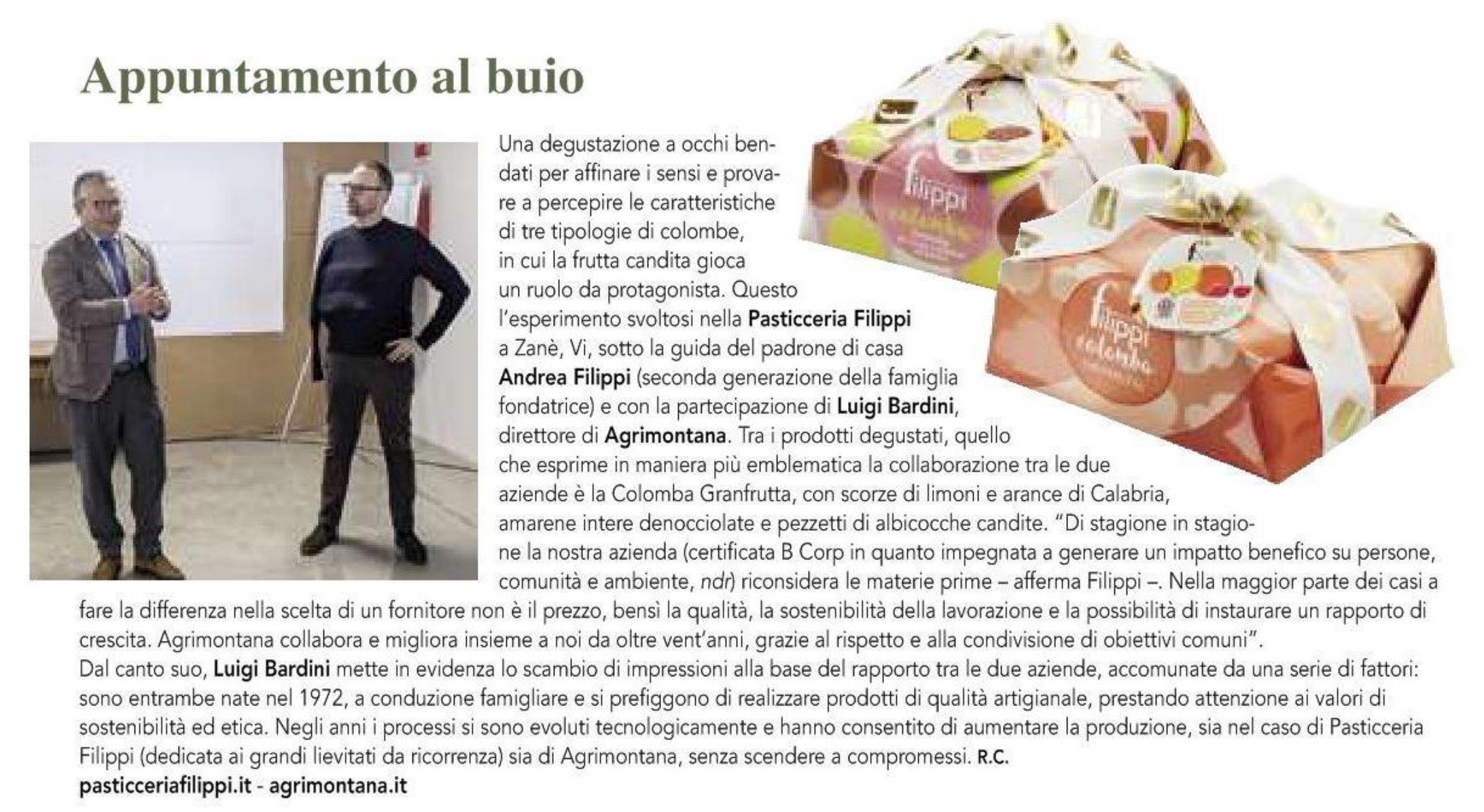 Una degustazione a occhi bendati per affinare i sensi e provare a percepire le caratteristiche di tre tipologie di colombe, in cui la frutta candita gioca un ruolo da protagonista. Questo l'esperimento svoltosi nella Pasticceria Filippi a Zanè, VI, sotto la guida del padrone di casa Andrea Filippi (seconda generazione della famiglia fondatrice) e con la partecipazione di Luigi Bardini, direttore di Agrimontana.
