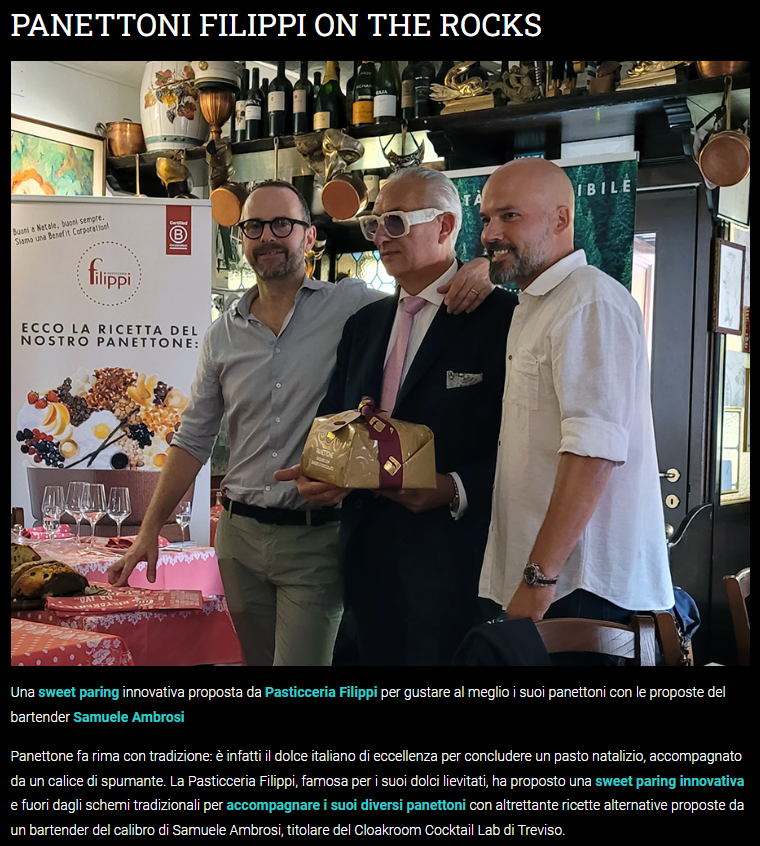 Panettone fa rima con tradizione: è infatti il dolce italiano di eccellenza per concludere un pasto natalizio, accompagnato da un calice di spumante. La Pasticceria Filippi, famosa per i suoi dolci lievitati, ha proposto una sweet paring innovativa e fuori dagli schemi tradizionali per accompagnare i suoi diversi panettoni con altrettante ricette alternative proposte da un bartender del calibro di Samuele Ambrosi, titolare del Cloakroom Cocktail Lab di Treviso.