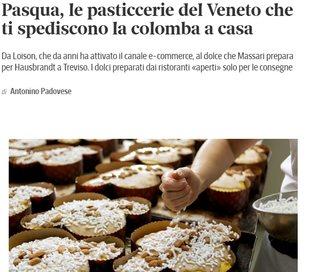 Dai laboratori artigianali delle pasticcerie alle tavole in un click. Il servizio di e-commerce e consegna a domicilio è al centro dell’articolo del Corriere del Veneto a firma di Antonino Padovese. Le pasticcerie artigianali venete infatti non si fanno trovare impreparate e affrontano il lockdown avviando o potenziando i loro shop online. La Pasticceria Filippi di Zanè spedisce a clienti e ai gourmet curiosi la novità di quest’anno, il dolce con cioccolato fondente Vidamà della Costa d’Avorio e pera candita.