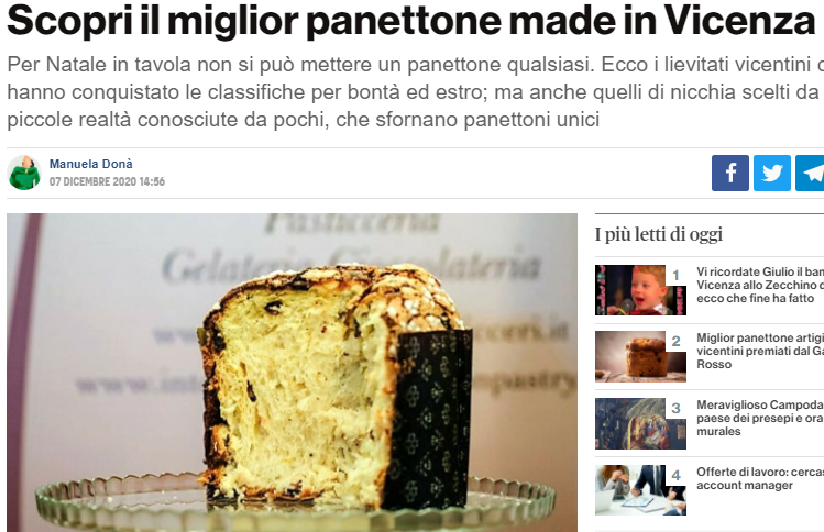 Vicenza Today raccoglie i migliori dolci natalizi del vicentino segnalati dalle guide di settore. La Pasticceria Filippi di Zanè compare con il panettone Mela e cannella, con mele candite morbide, succose e ben calibrate e un impasto che dopo la cannella emana profumo di burro che in bocca si traduce in un morso morbido e piacevole.